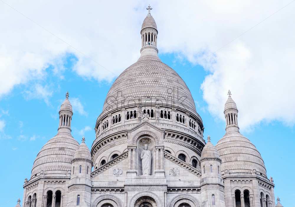 Home » Shop » photo » Close up shot to Sacre Coeur Basilica in Paris. Wonderful architecture of old French buildings. Clouds in the sky with a bright blue tone
