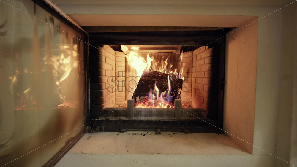 Close up view of a lit fireplace with burning logs and visible flames