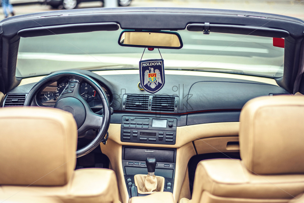 Close-up view to a car with Moldova sign hanging. Car travel idea. Chisinau city