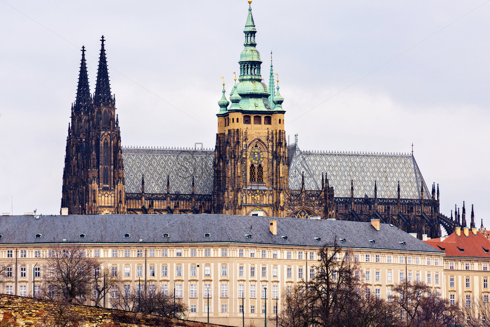 Close-up view to Cathedral of St. Vitus, a part of the castle. Cloudy day. Negative copy space, place for text. Prague, Czech Republic