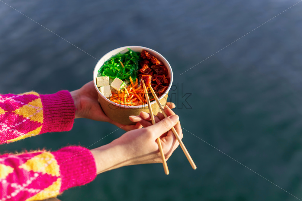 Close vertical view of a woman rating poke bowls with vegetables and seaweed salad using chopsticks