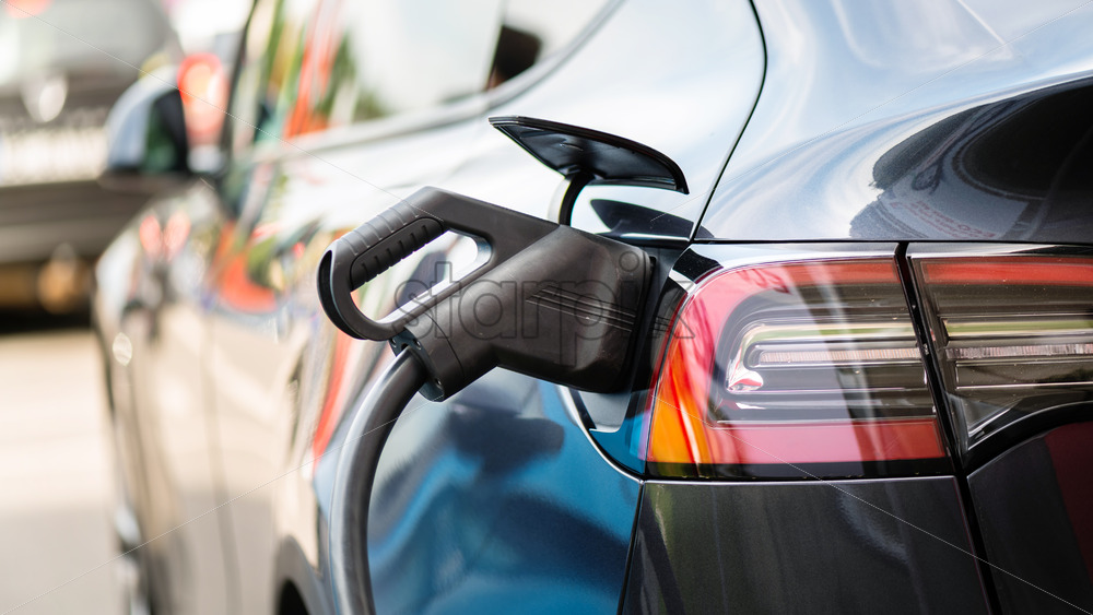 Vertical view of a parking place and charger for electric cars, a car nearby