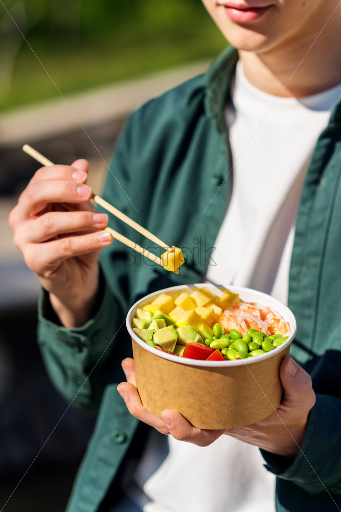 Home » Shop » photo » Close view of a man eating a poke bowl with vegetables, fruits and shrimps using chopsticks