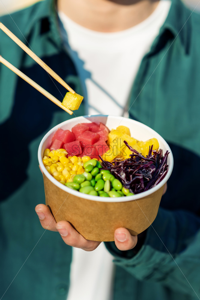 Close view of a man eating a poke bowl with vegetables, fruits and shrimps using chopsticks