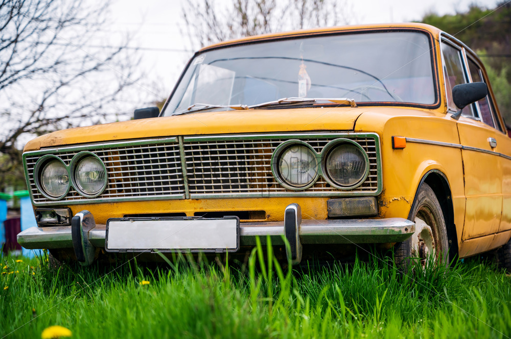 Daylight view to boat parked in local canal near sidewalk. Complementary colored red and green buildings on background. Sun shining. Negative copy space, place for text. Burano, Italy
