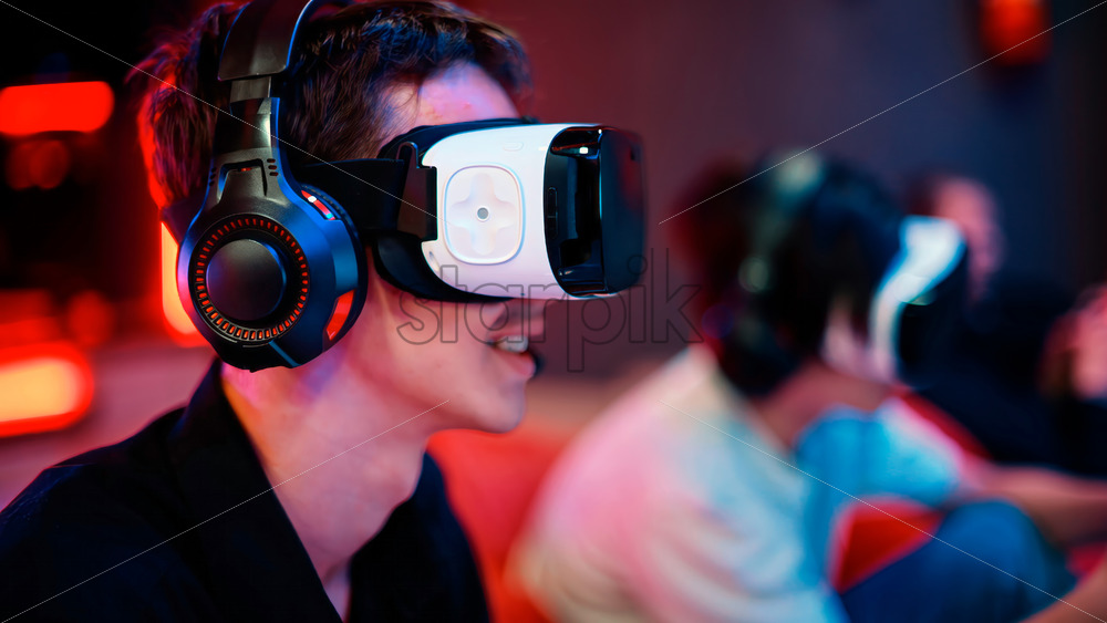 Home » Shop » photo » Close view of a smiling teen playing a game console in VR headset and headphones. Blue and red illumination