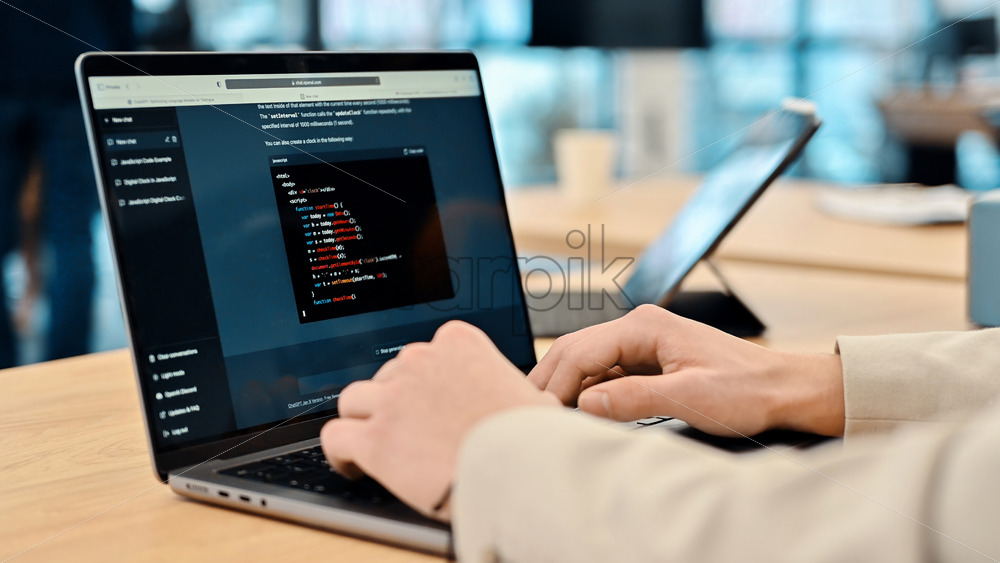 CHISINAU, MOLDOVA – APRIL, 2023: A person making a request in ChatGPT on a laptop to write a clock in C. Chat bot providing an example