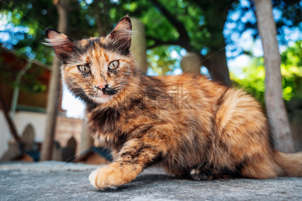 Close view of a street cat with multicoloured fur in Istanbul, Turkey