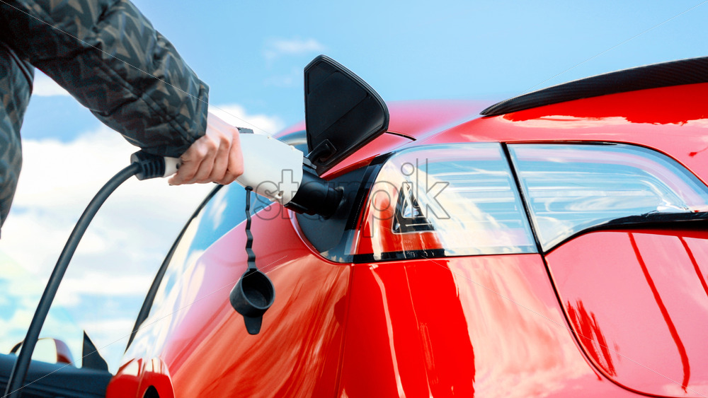 Close view of a man plugging charging cable into a parked red electric car at sunset Royalty Free Stock Video Footage