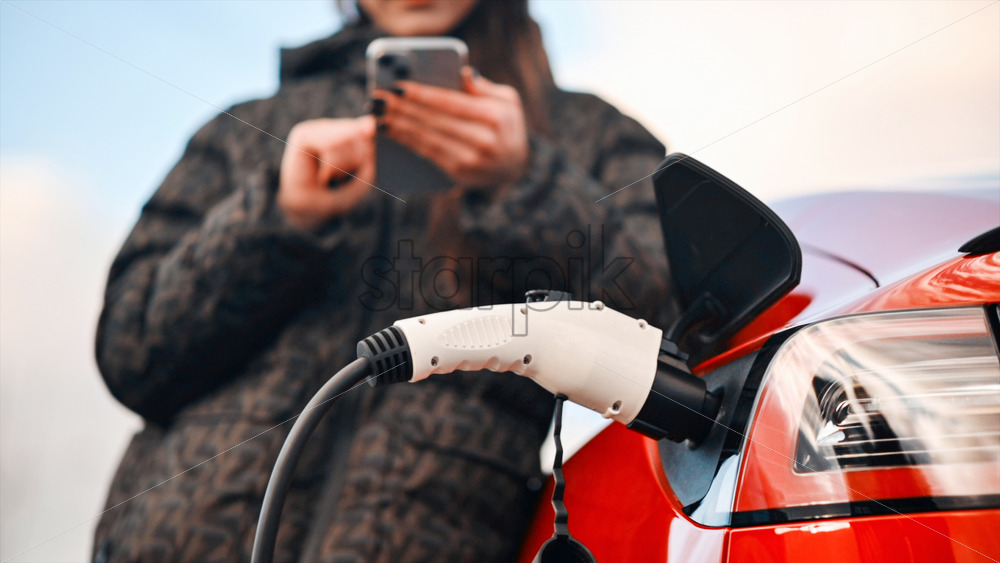 Home » Shop » photo » Close view of a woman using smartphone near her charging red electric car