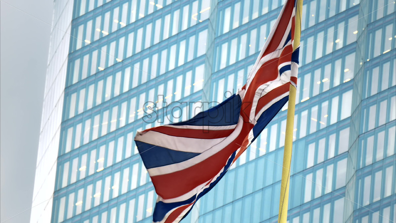 Close view of flag of the United Kingdom with skyscraper on the background London downtown. Slow motion Royalty Free Stock Video Footage