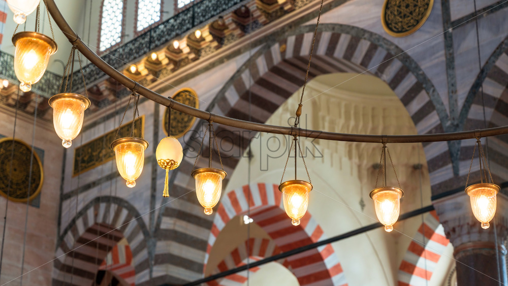 Close view of lamps inside the Suleymaniye mosque in Istanbul, Turkey. Illumination, painted walls