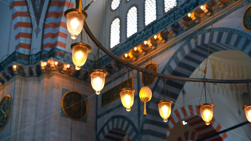 Close view of lamps inside the Suleymaniye mosque in Istanbul, Turkey. Illumination, painted walls Royalty Free Stock Video Footage
