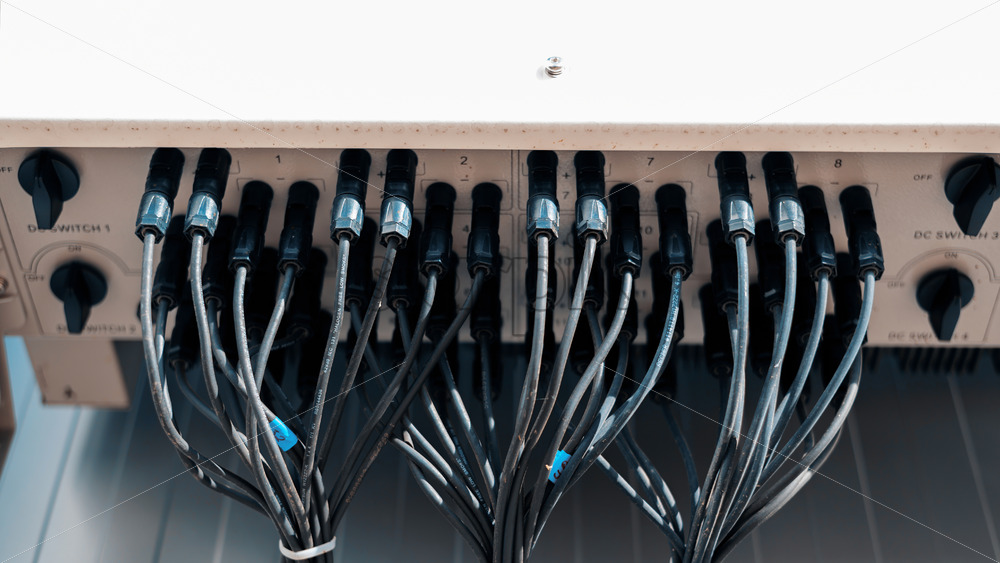 Close view of supporting systems for solar panels located on a manufacturing building , lots of connected wires. Ecology thematics