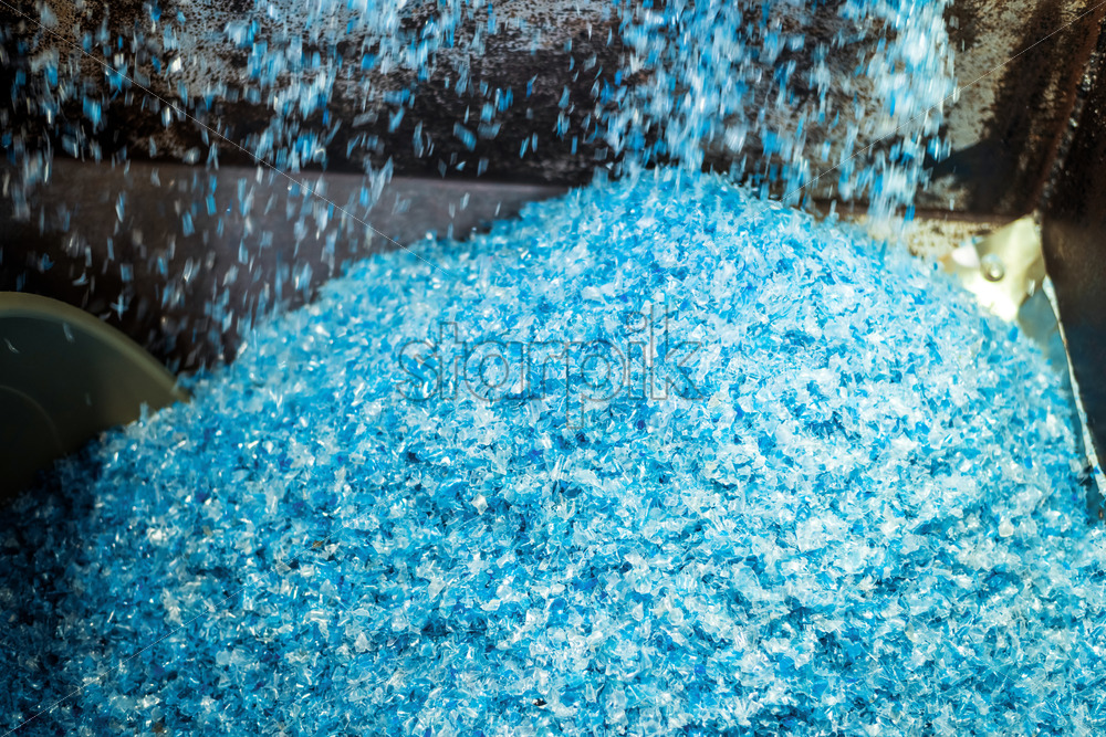 Close view of the blue shredded plastic garbage falling from a conveyor belt at waste recycling factory