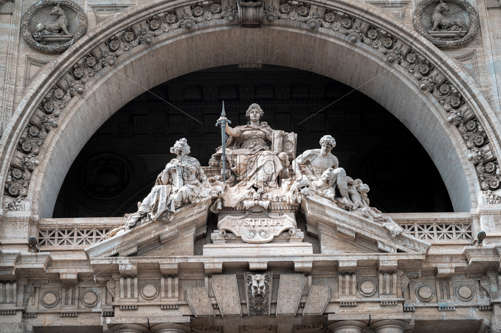 Close view of the facade of the Supreme Court of Cassation located in Rome center, Italy. Facade with sculptures