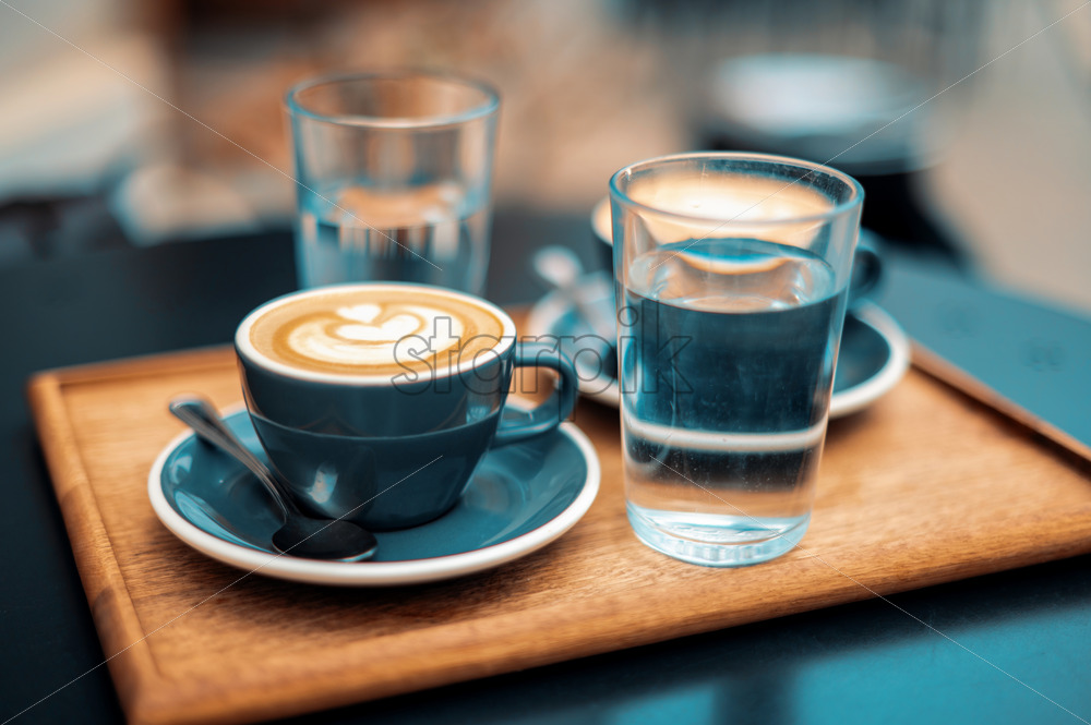 Home » Shop » photo » Close view of two cups of coffee with milk with two cups of water