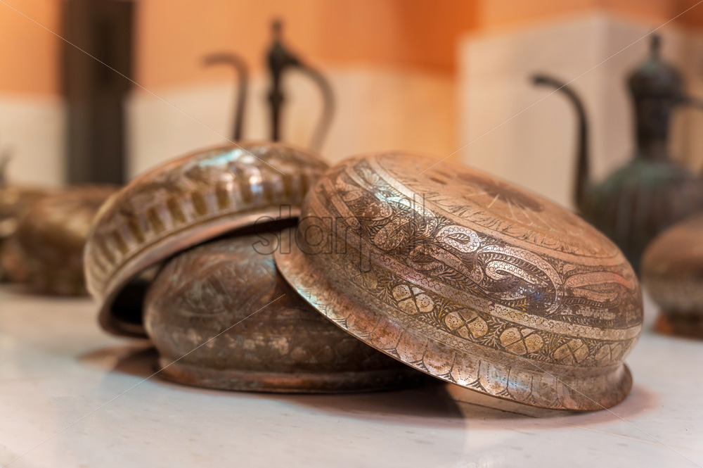 Close view of vintage painted dishes in hamam museum in Istanbul, Turkey.