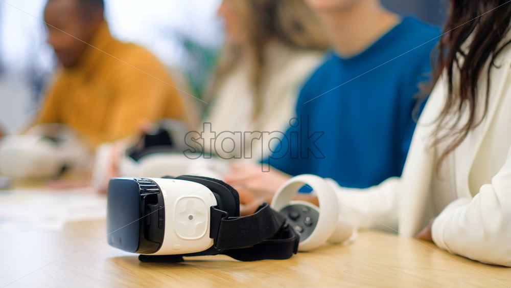 Home » Shop » photo » Close view of VR glasses and controllers on a table at business conference in an office