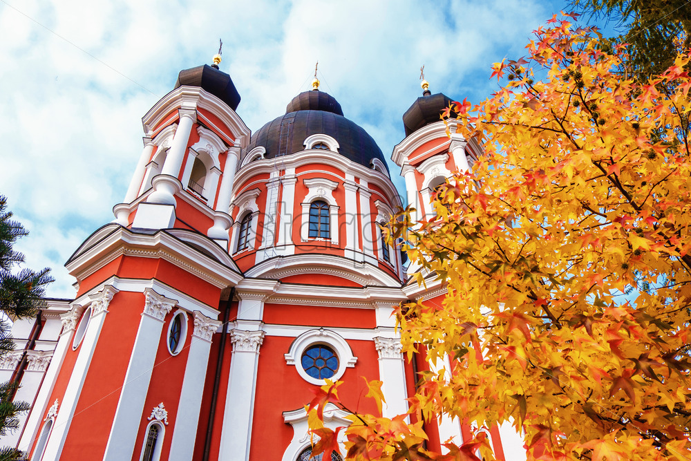 Close view to Curchi Monastery in Old Orhei, Moldova. Ortodox place in Europe with a beautiful architecture painted in a vibrant red colour Royalty Free Stock photo