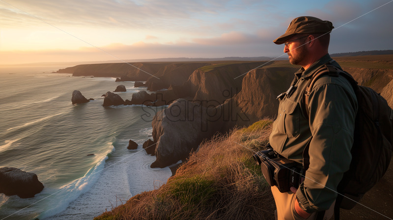A dedicated forest ranger overlooking a rugged coastal landscape during the soft morning light.