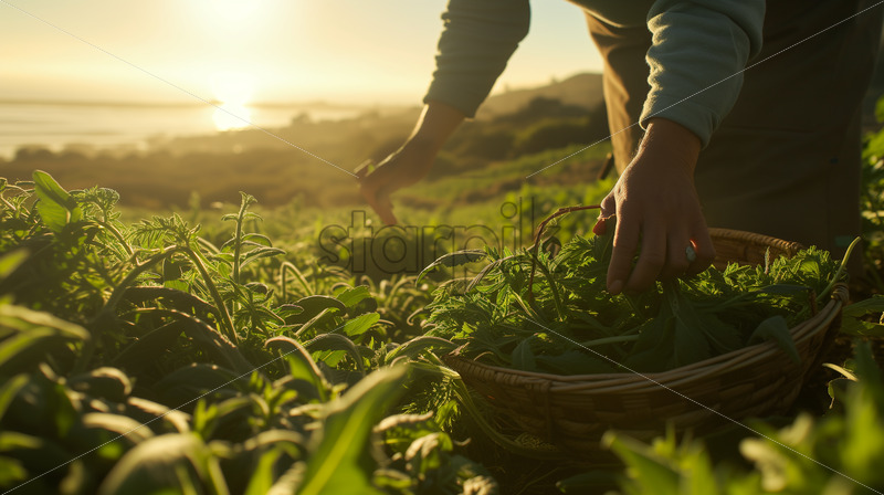 A hardworking farmworker in the sun-drenched coastal fields, harvesting crops against the backdrop of the ocean, with a basket filled with freshly picked produce.