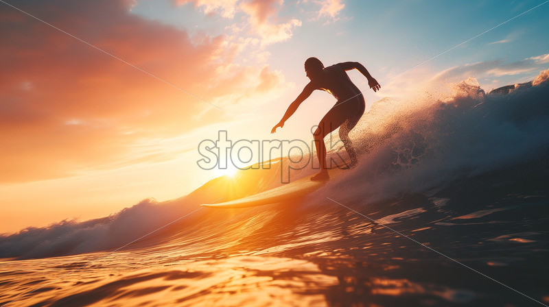 A skilled longboard surfer catching a wave along the iconic coastline during the golden hour,capturing the free-spirited lifestyle and surf culture.