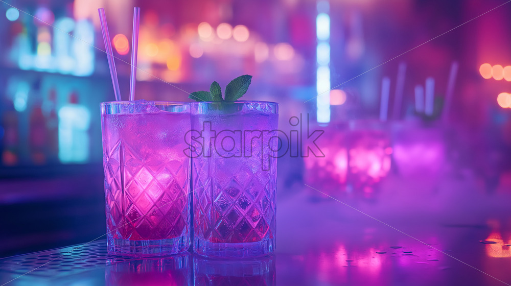 cocktails served in geometric glassware, with dry ice fog neon lights