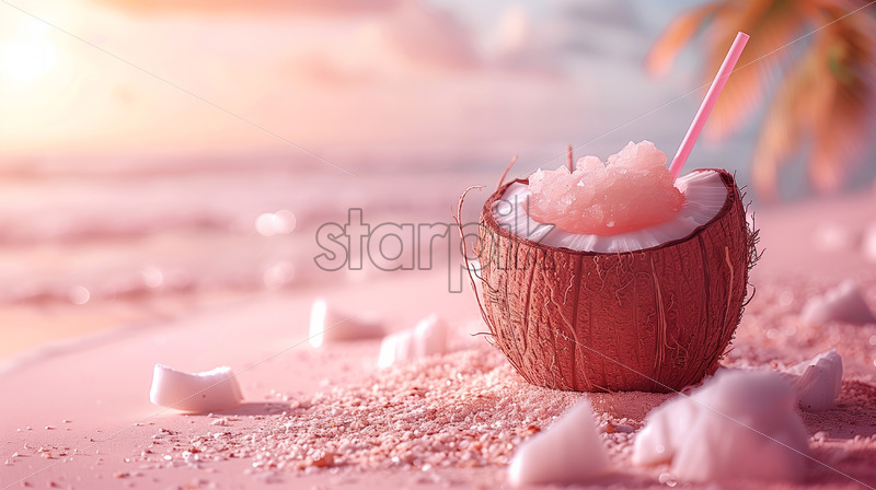 Home » Shop » AI Illustration » Coconut drink cocktail on a tropical pink beach, delicate summer banner