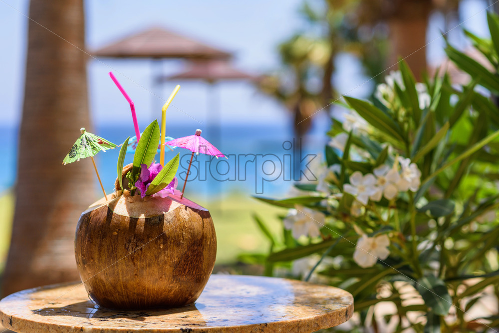 Coconut fruit on a table with sea view, colored straws and umbrellas, palm trees, protaras, cyprus island