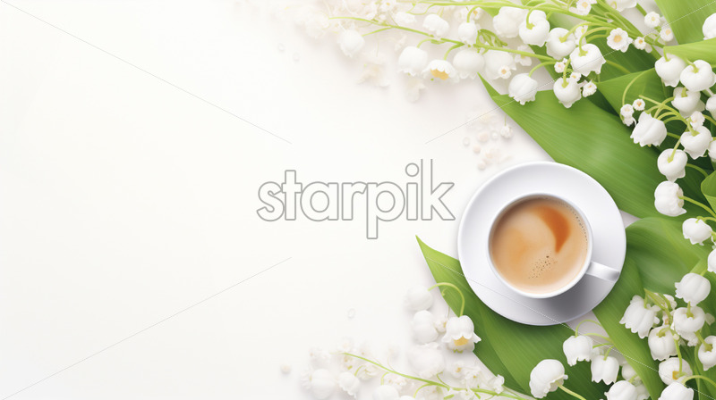 Coffee cup with spring bouquet of flowers lily of the valley
