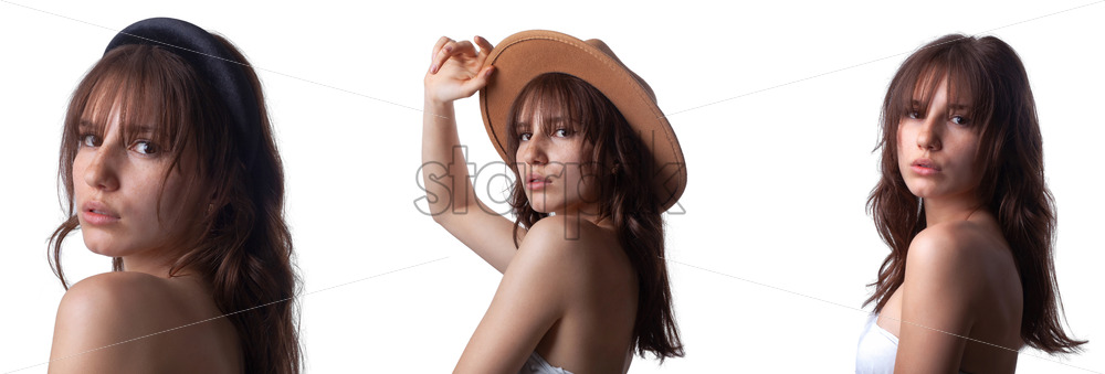 Collage of a beautiful caucasian girl posing at the camera. Expressing tenderness. Isolated background