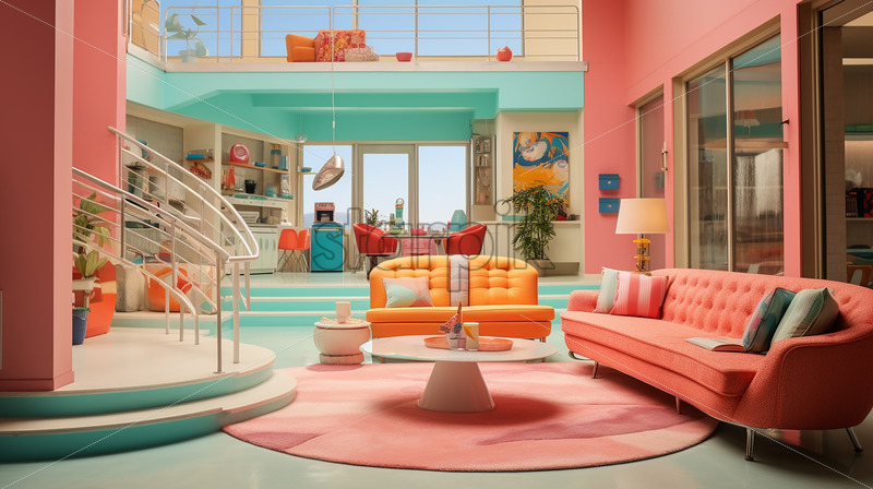 Colorful house in the city with their colorful cozy couch and clear glass sliding door