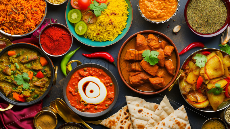 Immerse yourself in the world of rich and flavorful Indian curry through this captivating photograph, showcasing a variety of dishes with meat or vegetables cooked in a spiced sauce. The delectable curries are meticulously arranged in a bowl or on a plate, garnished with cilantro or a swirl of yogurt. The setting unfolds in either a traditional Indian dining room or a vibrant street food market, bathed in warm, soft light that beautifully highlights the dish’s rich colors. Traditional Indian elements such as brass utensils, an array of aromatic spices, and colorful fabrics add cultural depth to this culinary masterpiece.