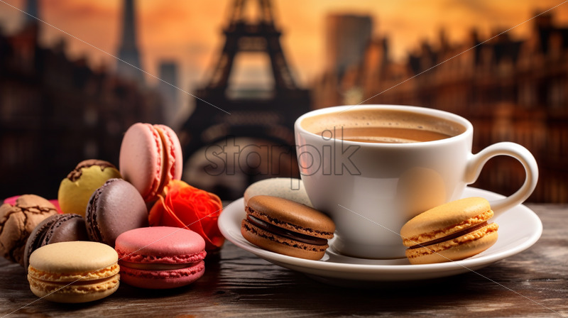 Colorful macarons and coffee cup, on wood table with Eiffel Tower on backgound