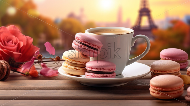 Colorful macarons and coffee cup, on wood table with Eiffel Tower on backgound