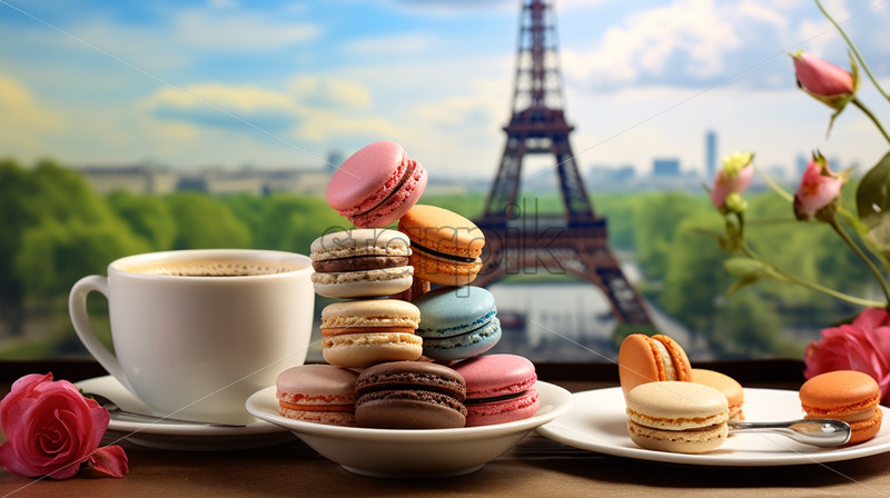 Colorful macarons and coffee cup, on wood table with Eiffel Tower on backgound