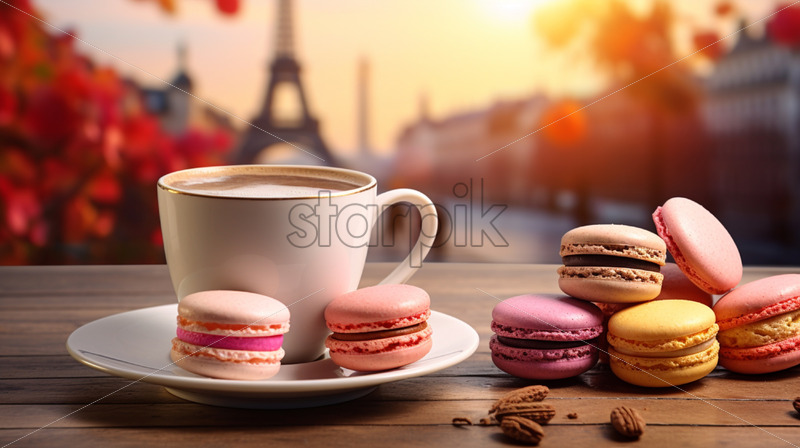 Colorful macarons and coffee cup, on wood table with Eiffel Tower on backgound