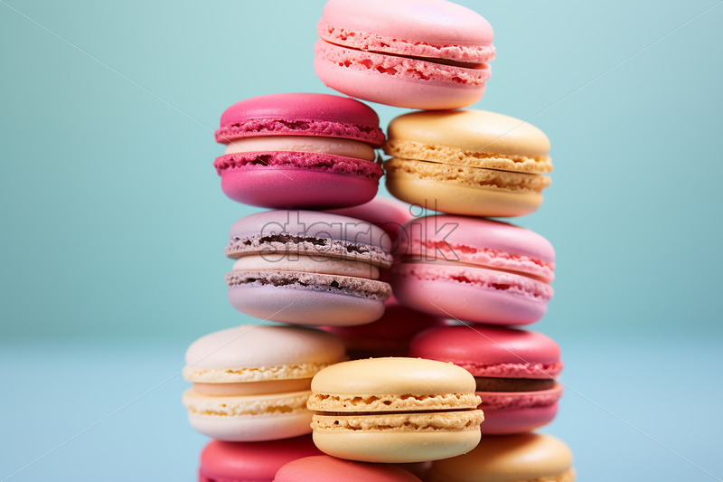 Colorful macarons and coffee cup, on wood table with Eiffel Tower on backgound