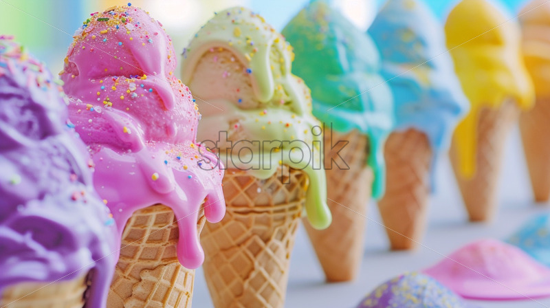 Colourful ice cream cones close up product placement