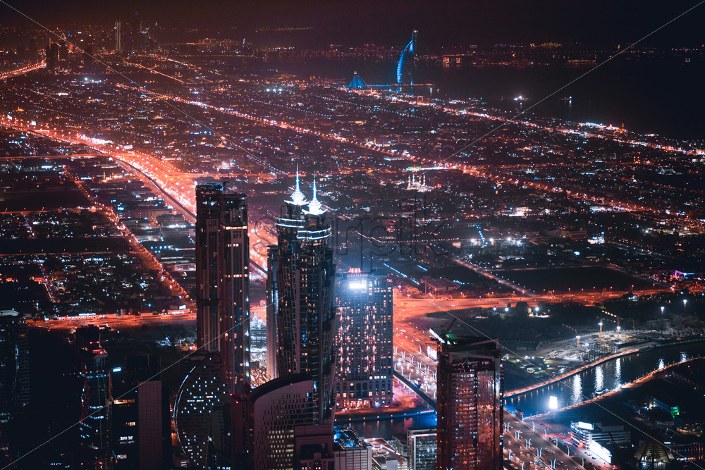 Colourful view of Dubai, United Arab Emirates. Aerial view on highways and skyscrapers. Wide angle shot of the cityscape Royalty Free Stock photo