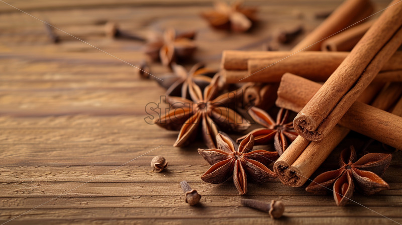 Combination of cinnamon sticks and star anise on wooden surface