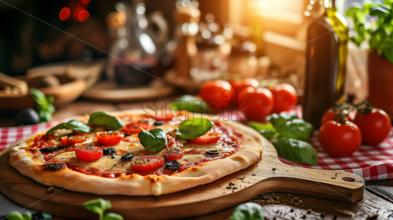 A picturesque photograph featuring a rounded Italian pizza, a flatbread adorned with tomato sauce, cheese, and an assortment of toppings, artfully displayed on a wooden board in a cozy rustic Italian kitchen. The scene highlights the communal aspect of dining, accompanied by props like olive oil bottles, vintage wine glasses, and checkered tablecloths. The warm ambient light gracefully complements the rich colors, creating a delightful atmosphere.
