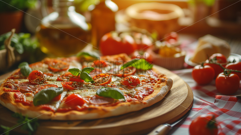 An inviting photograph capturing a rounded Italian pizza, a flatbread adorned with tomato sauce, cheese, and an assortment of toppings, elegantly displayed on a wooden board in a cozy rustic Italian kitchen. The scene skillfully showcases the communal aspect of dining, complemented by carefully arranged props like olive oil bottles, vintage wine glasses, and checkered tablecloths. The warm ambient light gracefully complements the rich colors, creating an atmosphere perfect for shared enjoyment.