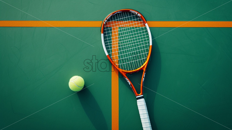 Home » Shop » Uncategorised » Composition with tennis racket, ball, net on hard court