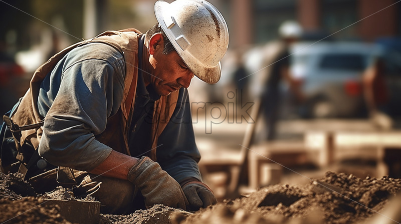A hardworking construction worker, clad in complete PPE and gloves, engages in focused manual work on the dirt ground, the blurred background capturing the intensity of the task.