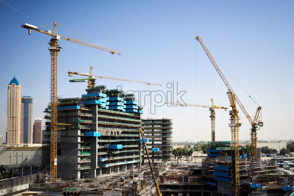 Construction site with cranes and people working. Dubai, United Arab Emirates Royalty Free Stock photo