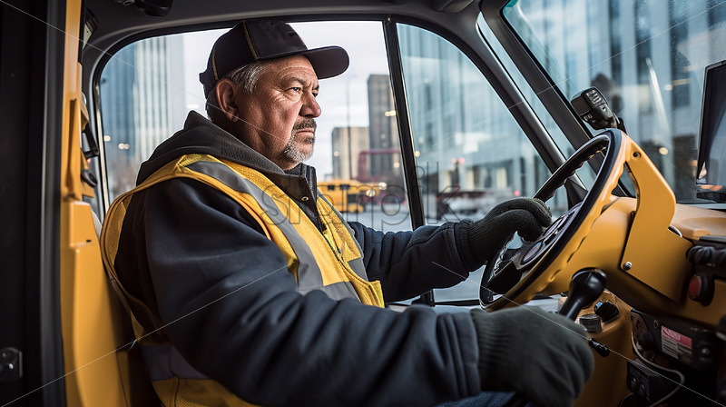 Serious construction worker driving heavy equipment in the street wearing personal protective equipment and a construction outfit with hat