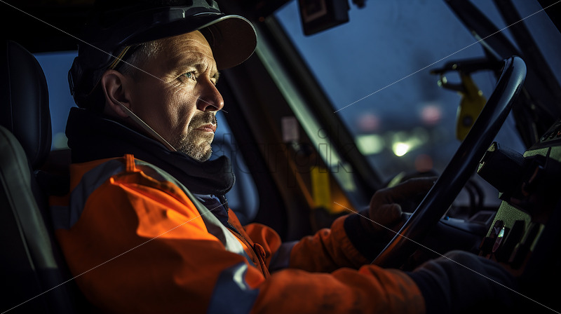 Serious construction worker driving the truck wearing personal protective equipment and a construction outfit with hard hat
