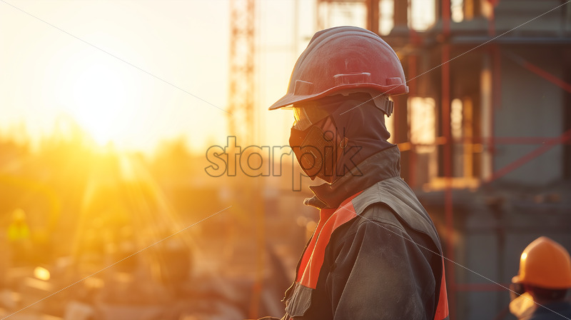 A construction worker, fully clad in PPE, stands atop the building site, gazing down at the street below, symbolizing the achievement and perspective gained from the heights of construction work